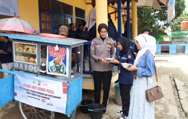 Pesta Demokrasi di Way Kanan Lampung, Polisi menggelar makan dan minum gratis di Seketariat PPK (Panitia Pemilihan Kecamatan) Kecamatan Baradatu Kabupaten Way Kanan. Rabu (21/02/2024).