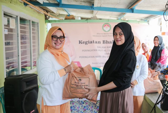 Bandar Lampung —- Pj. Ketua Dharma Wanita Persatuan (DWP) Provinsi Lampung, Siti Fatimah Fredy menggelar Kegiatan Bakti Sosial Dalam Rangka Memperingati HUT Ke-25 DWP Provinsi Lampung sekaligus Peringatan Hari Ibu (PHI) Ke-96 Tahun 2024, di Kemiling Permai Kecamatan Kemiling, Kamis (05/12/2024).