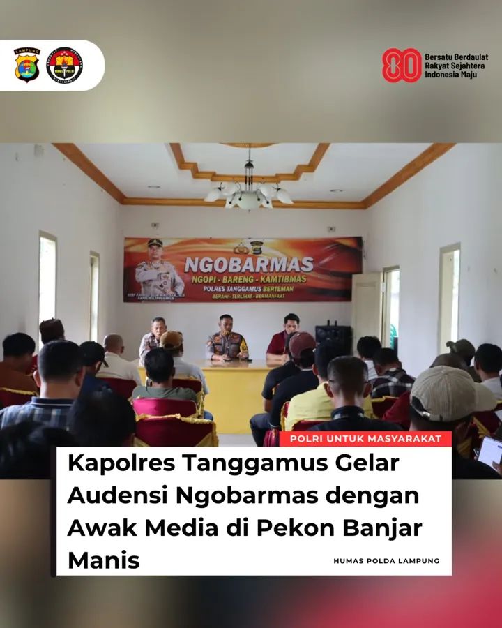 Lampunglive.com – Kapolres Tanggamus AKBP Rahmad Sujatmiko, SIK, MH memimpin audensi Ngobarmas (Ngopi Bareng Kamtibmas) bersama para awak media online dan TV wilayah Tanggamus. Kegiatan yang berlangsung di Rumah Makan Bebek Menor, Pekon Banjar Manis Pada hari Selasa, 5 Agustus 2025, pukul 13.00 Wib.