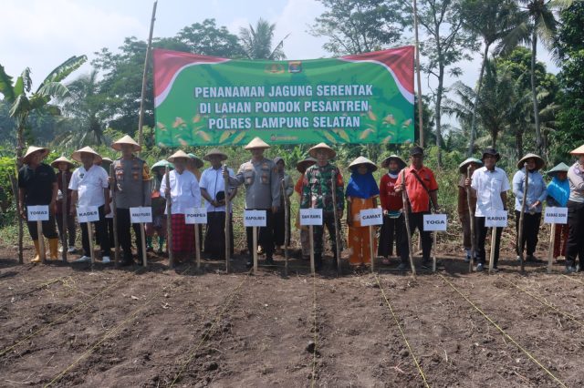 Lampung Selatan – Dalam upaya memperkuat ketahanan pangan nasional, Kapolres Lampung Selatan AKBP Toni Kasmiri, memimpin langsung kegiatan penanaman jagung serentak di lahan milik Pondok Pesantren Rodhotul Muta’allimin, Desa Canggu, Kecamatan Kalianda, pada Rabu (6/8/2025).