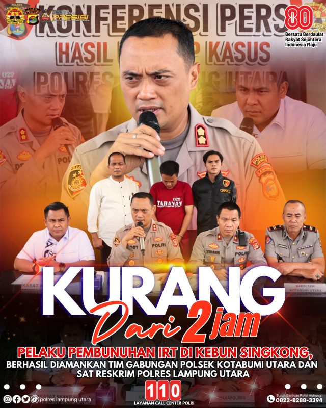 “Alhamdulillah kurang dari dua jam setelah korban ditemukan, tim Tekab 308 Polres Lampung Utara berhasil mengamankan pelaku,” kata Kapolres AKBP Deddy saat menggelar Konferensi Pers didampingi Waka Polres Kompol Yohanis, Kasat Reskrim AKP Apfryyadi dan Kapolsek Kotabumi Utara Iptu Hermanto, Jumat (22/8/2025).