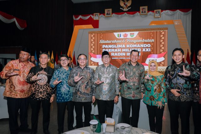 BANDARLAMPUNG —– Gubernur Lampung Rahmat Mirzani Djausal menggelar acara silaturahmi dan penyambutan Pangdam XXI/Radin Inten Mayjen TNI Kristomei Sianturi di Provinsi Lampung, di Aula Mahan Agung, Rumah Dinas Gubernur Lampung, Bandarlampung, Senin (13/10/2025).