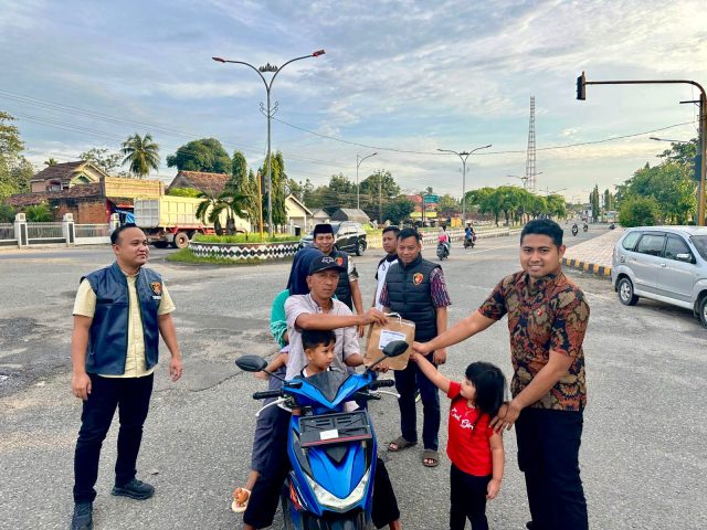 Sebanyak 300 paket takjil dibagikan kepada para pengendara roda dua maupun roda empat yang melintas.