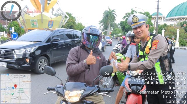 Metro – Dalam semangat berbagi di bulan suci Ramadhan 1447 H/2026 M, Satuan Lalu Lintas (Satlantas) Polres Metro melaksanakan kegiatan pembagian 100 takjil berupa 50 botol jus buah dan 50 kue beraneka kepada masyarakat di kawasan Tugu Pena Kota Metro, Senin (23/02/26) sore.