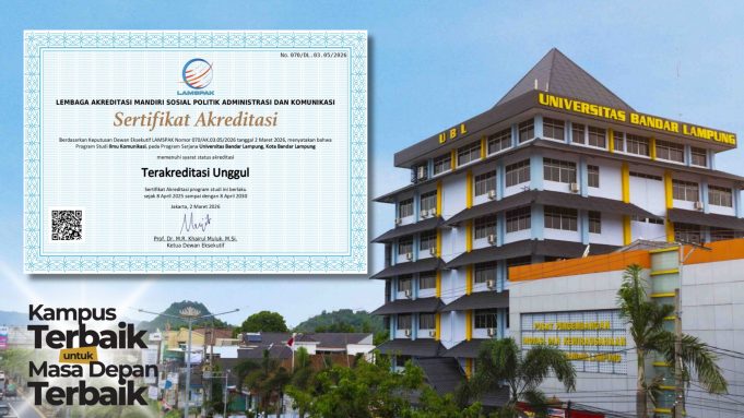 Bandar Lampung – Kabar membanggakan kembali datang dari Universitas Bandar Lampung (UBL). Program Studi Ilmu Komunikasi untuk Program Sarjana (S1) resmi meraih akreditasi Unggul dari Lembaga Akreditasi Mandiri Sosial Politik Administrasi dan Komunikasi (LAMSPAK).