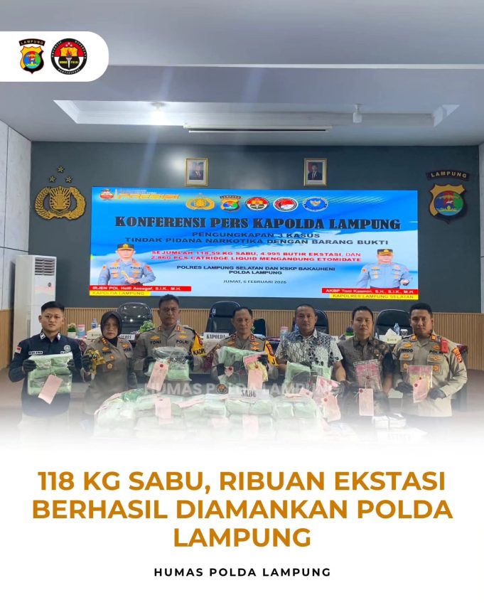Lampunglive.com - Kapolda Lampung Irjen Pol. Helfi Assegaf, S.I.K., M.H., memimpin langsung konferensi pers pengungkapan tiga kasus tindak pidana narkotika dengan total barang bukti sekitar 118 kilogram sabu di Polres Lampung Selatan, Jumat (6/2/2026).