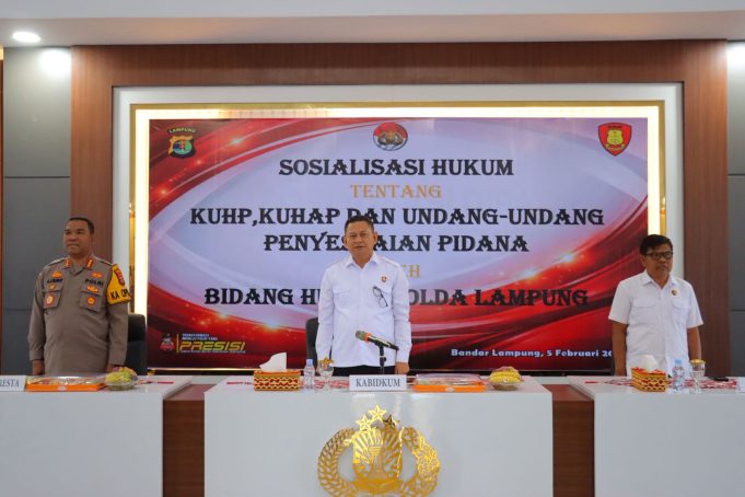 LAMPUNG – Kabidkum Polda Lampung Kombes Pol Ahmad Sukiyatno membuka kegiatan Sosialisasi Hukum di Polres jajaran Polda Lampung pada 5–13 Februari 2026. Kegiatan ini digelar untuk menguatkan pemahaman personel terhadap penerapan KUHP, KUHAP, dan Undang-Undang Penyesuaian Pidana yang resmi...