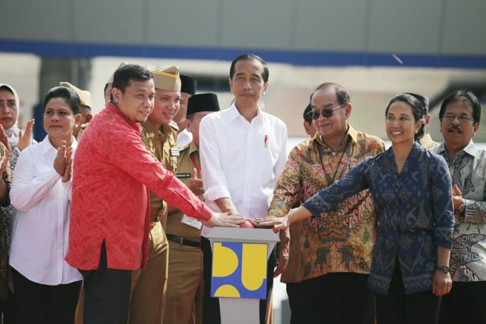 Presiden Joko Widodo (Jokowi) didampingi Ibu Negara Iriana bersama Gubernur Lampung M. Ridho Ficardo dan tiga Menteri Kabinet Kerja yakni Menteri PUPR Basuki Hadimulyono, Menteri BUMN Rini Soemarno Menteri Perhubungan Budi Karya Sumandi meresmikan Jalan Tol...