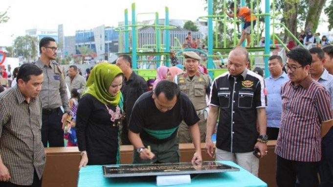 Gubernur Lampung, Muhammad Ridho Ficardo meresmikan Taman Bermain Anak Elephant Park, di Lampung Elephant Park, Enggal Saburai Pusat Kota Bandar Lampung, Minggu (17/2/2019) Sore. Peresmian ditandai dengan penandatanganan prasasti, dilanjutkan dengan pelepasan balon ke udara.