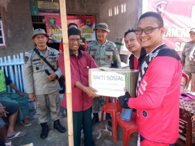 Lampunglive.com - Kapolres Pesawaran AKBP Popon Ardianto Sunggoro bagikan bingkisan sembilan bahan pokok (sembako) kepada warga di Desa Talang Mulya Kecamatan Teluk Pandan, Sabtu (03/11).