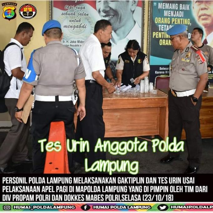 Lampunglive.com - Divisi Propam Mabes Polri dan Dokkes Mabes Polri melaksanakan tes urine di halaman mapolda Lampung, Selasa (23/10).